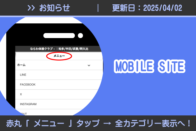 ■ スマートフォン、タブレット等をご利用のお客様へ 上記赤丸内の「 メニュー 」をタップして下さい。 全カテゴリーを表示、希望ページへダイレクトで移動出来ます。 |