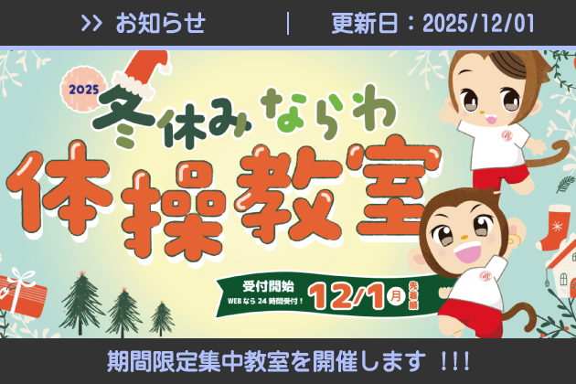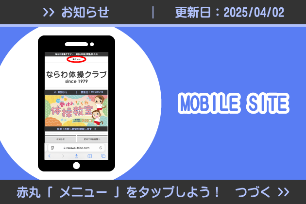 ならわ体操クラブのHPをご覧頂きありがとうございます。 初回は、不安だったり緊張したりと、なかなか踏み出す事が出来ません。 当クラブでは、無料体験を常時実施! また、不定期になってしまいますが、お得な短期教室も開催しています! 最初の1歩目のきっかけとして頂ければ幸いです。 |