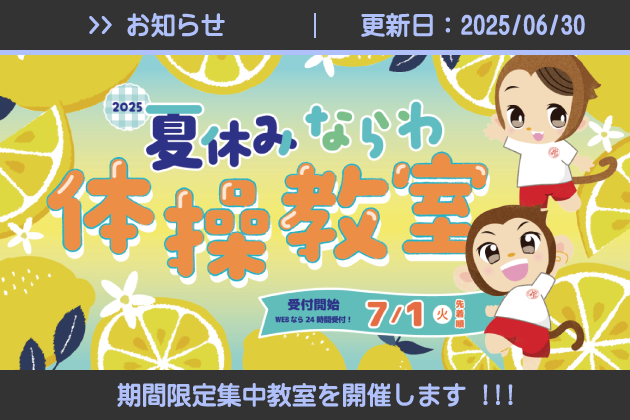 ならわ体操クラブのHPをご覧頂きありがとうございます。 初回は、不安だったり緊張したりと、なかなか踏み出す事が出来ません。 当クラブでは、無料体験を常時実施! また、不定期になってしまいますが、お得な短期教室も開催しています! 最初の1歩目のきっかけとして頂ければ幸いです。 |
